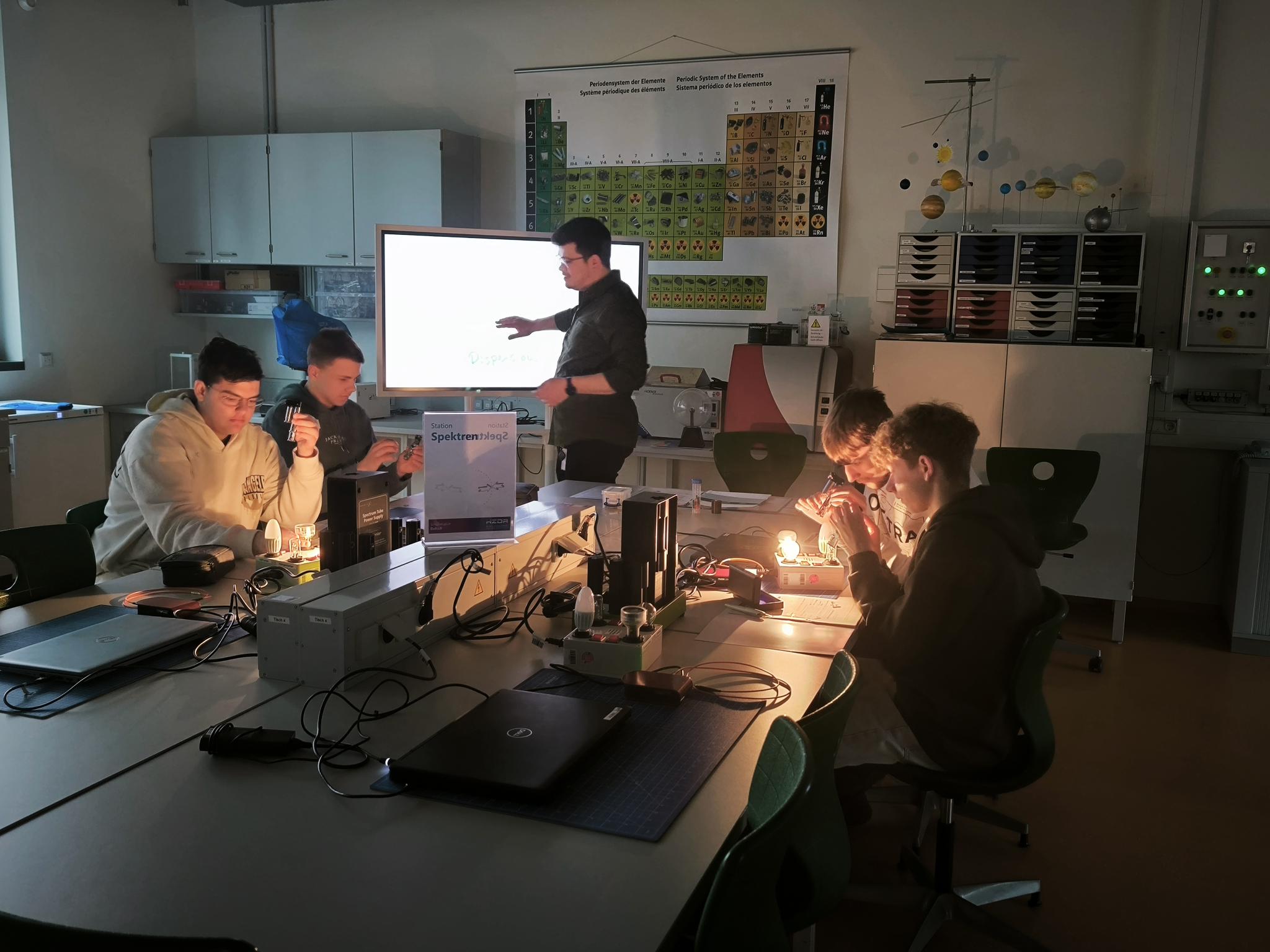 Dort wurden von allen Schülerinnen und Schülern Experimente zur additiven und subtraktiven Farbmischung, zur Interferenz des Lichtes und zu den verschiedenen Arten von Spektren durchgeführt. Es war ein sehr anspruchsvolles Programm, wie immer gut betreut vom Team des Schülerlabors.