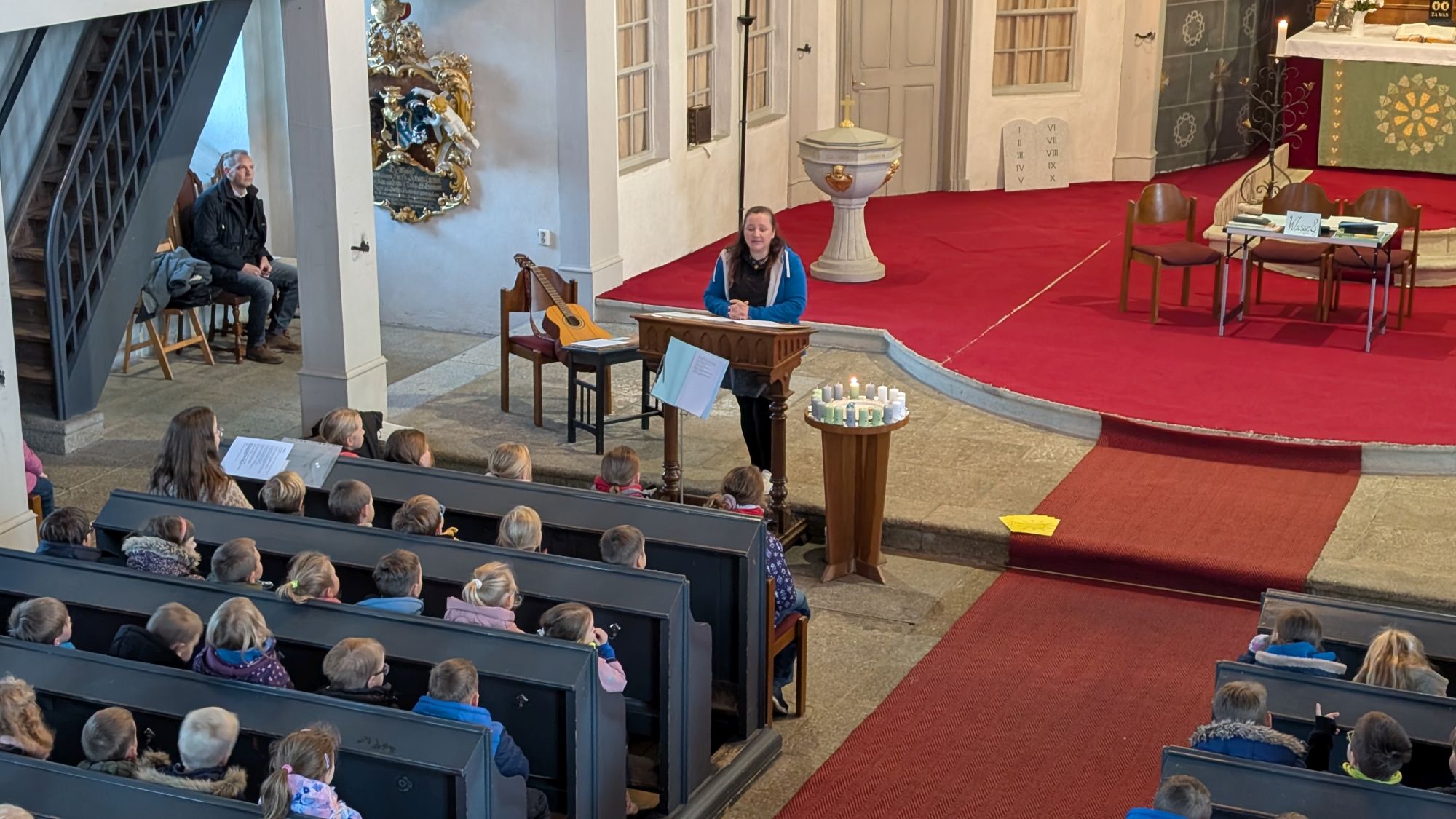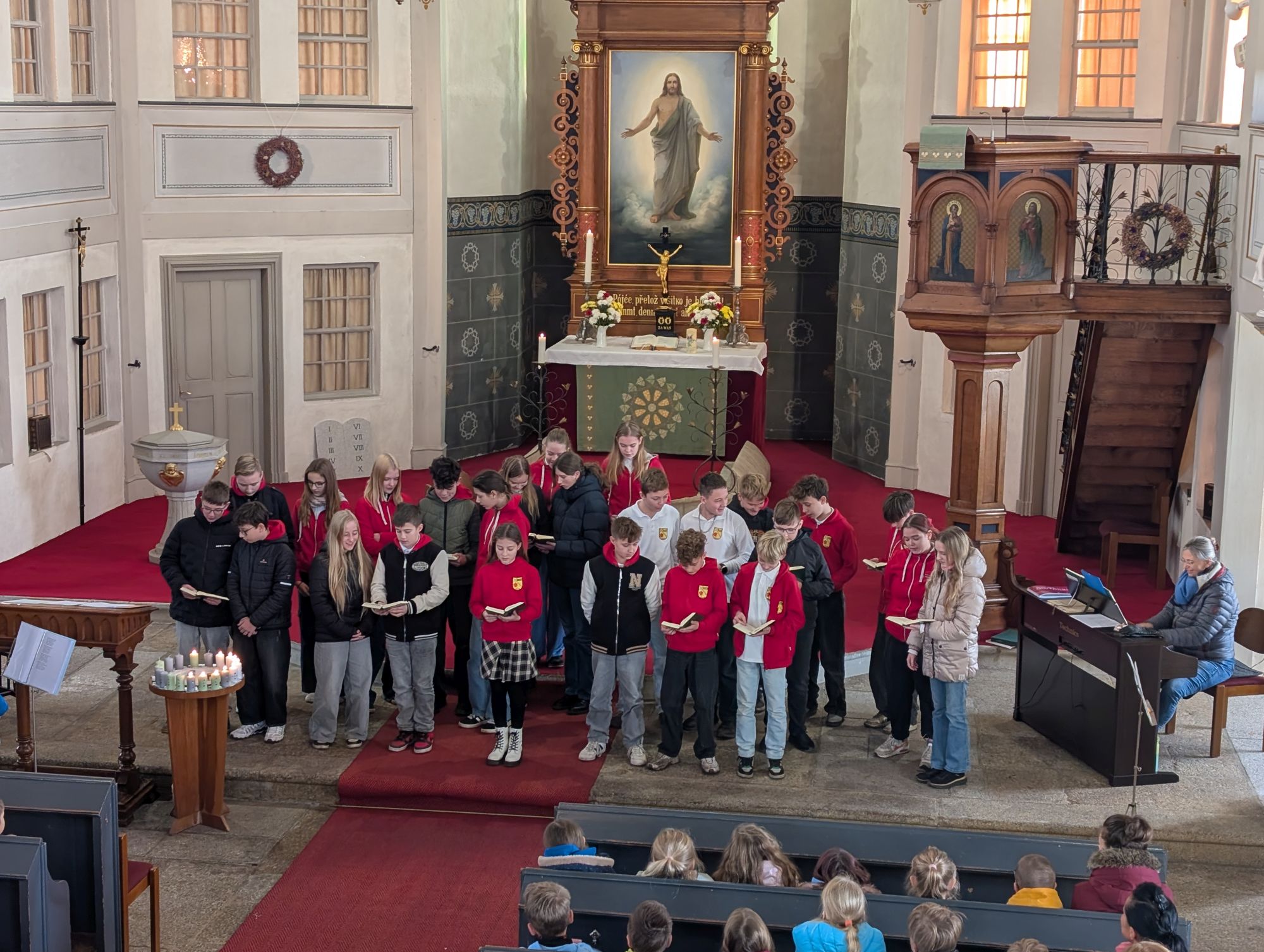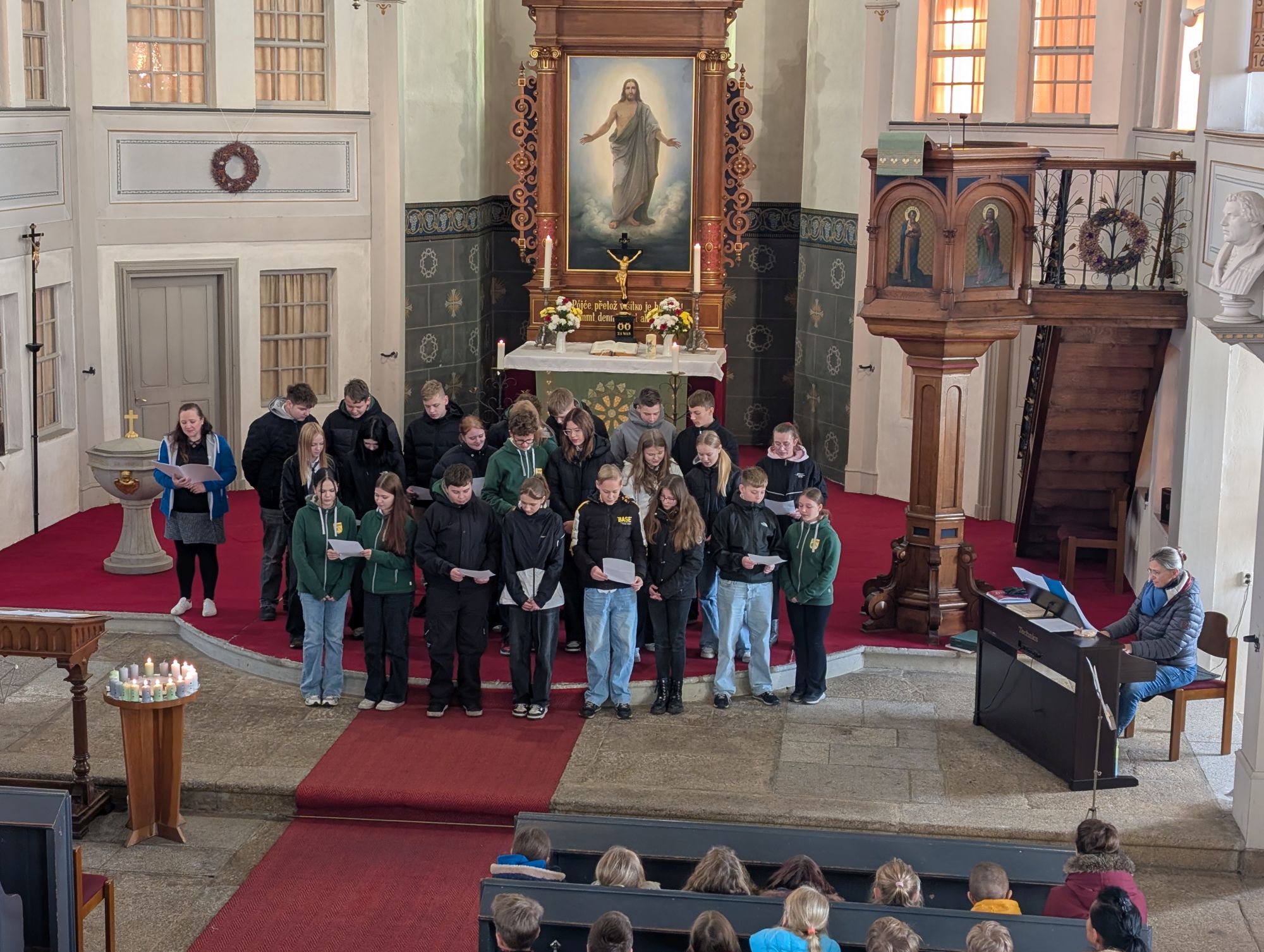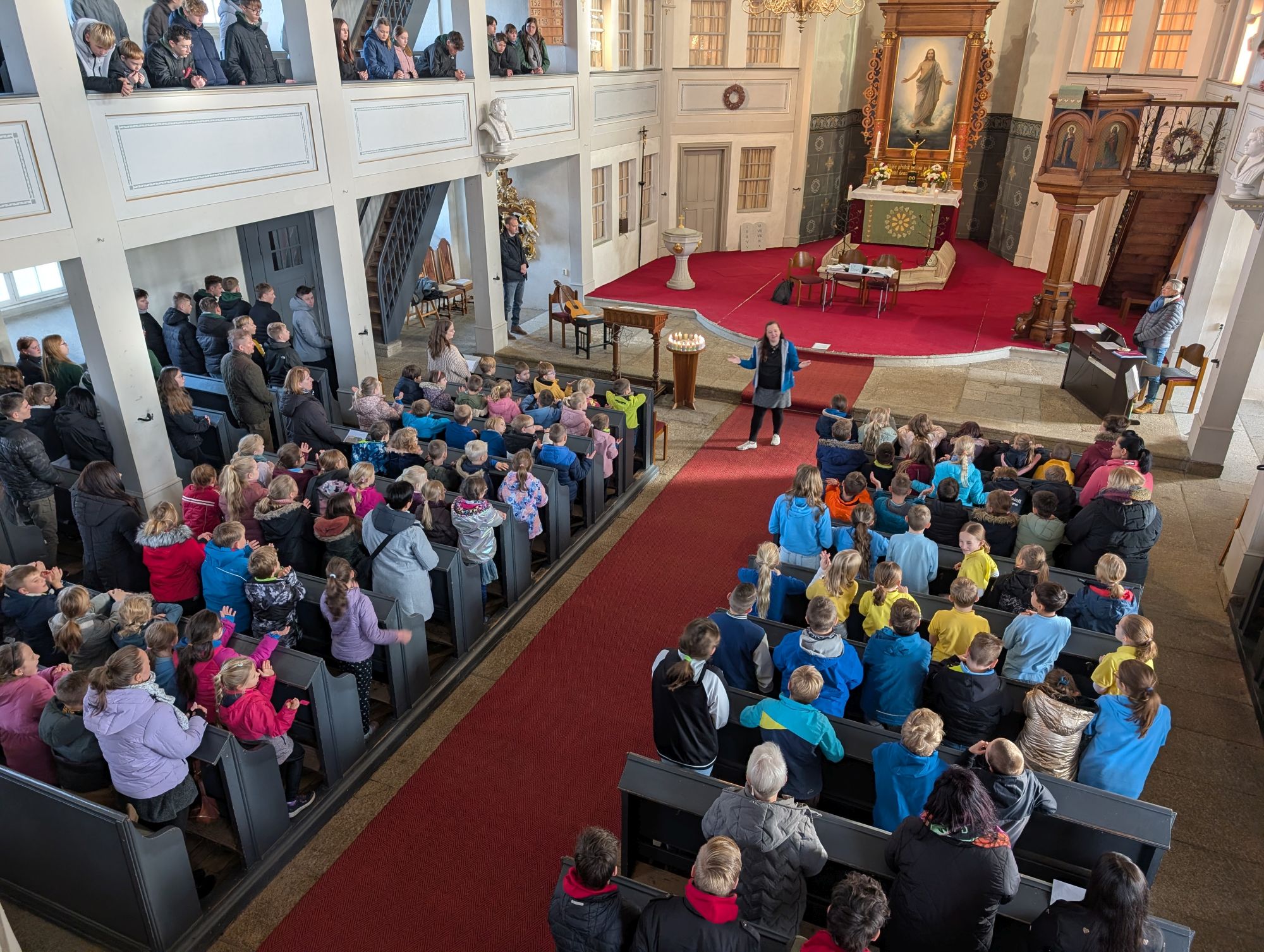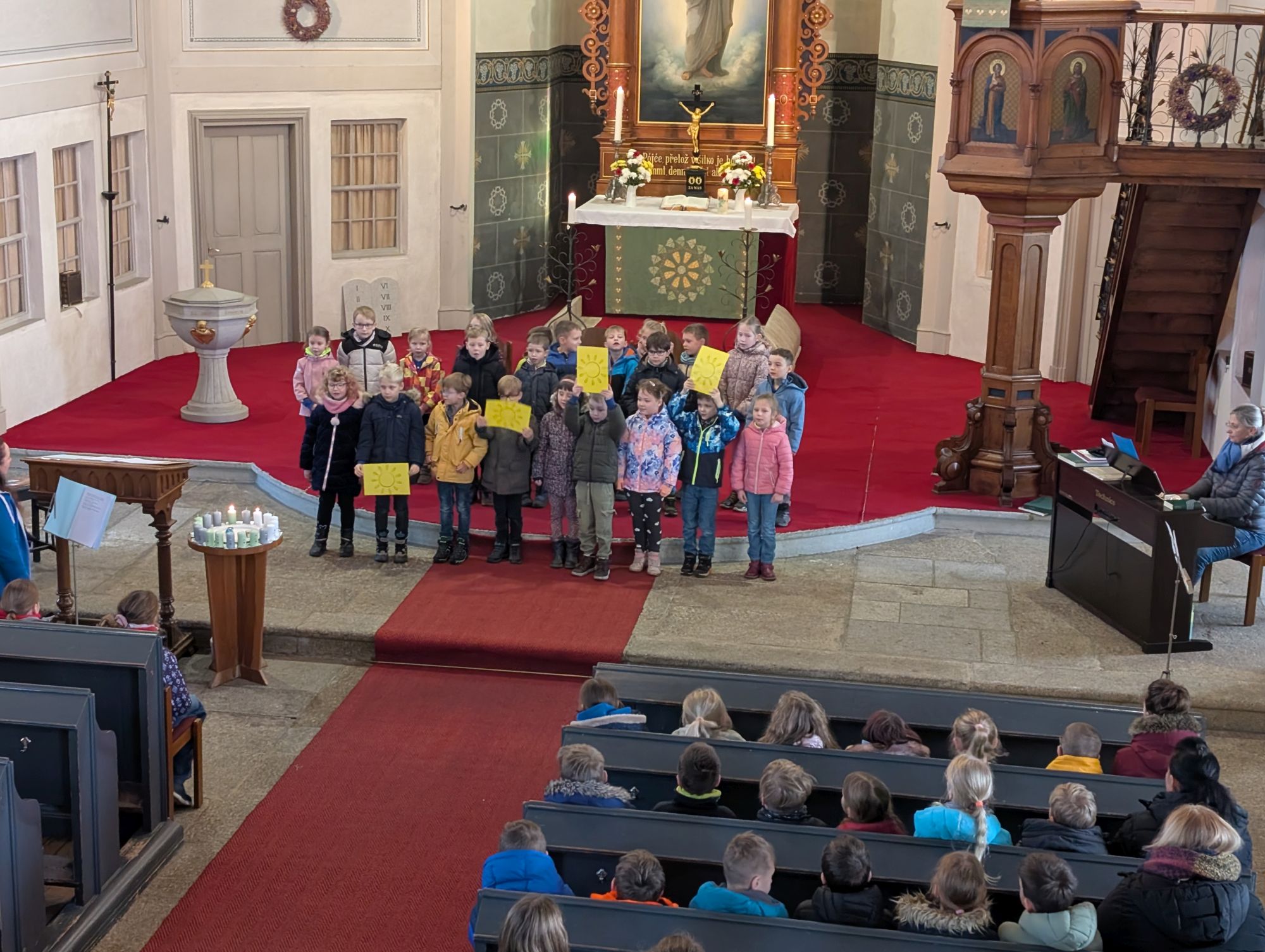 Frau Osang, unsere Religionspädagogin, hatte diesen Gottesdienst mit Schülern der Grundschule vorbereitet und alle waren mit viel Begeisterung bei der Sache.