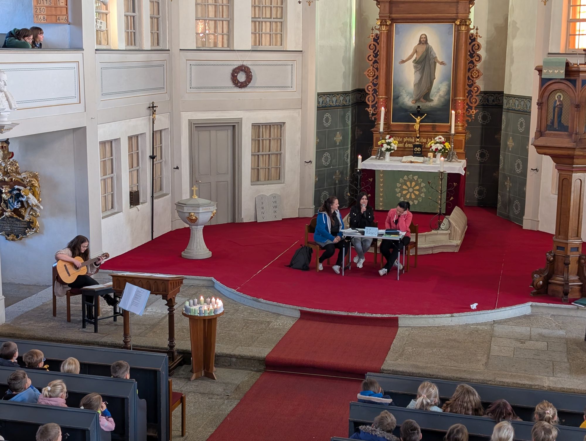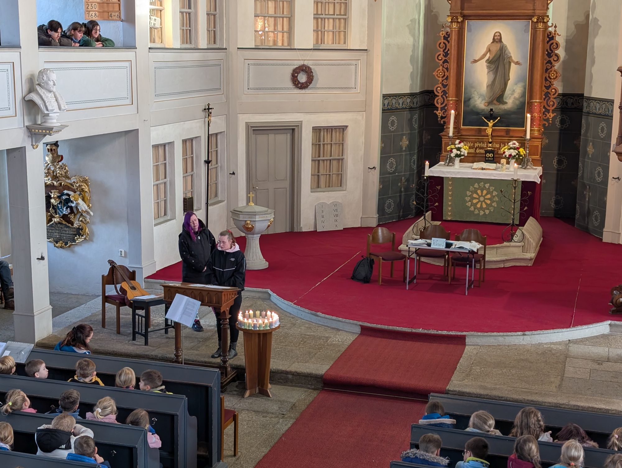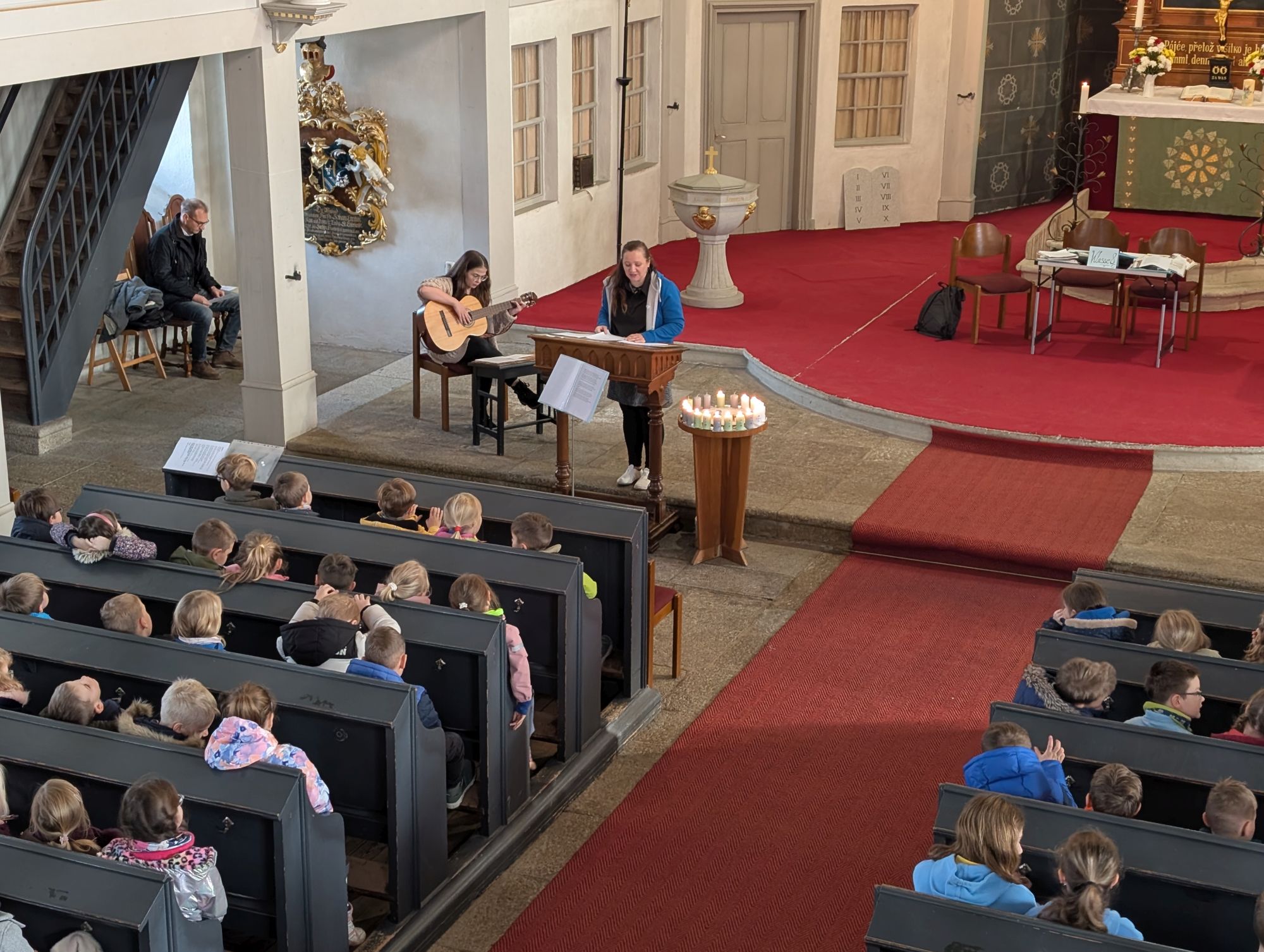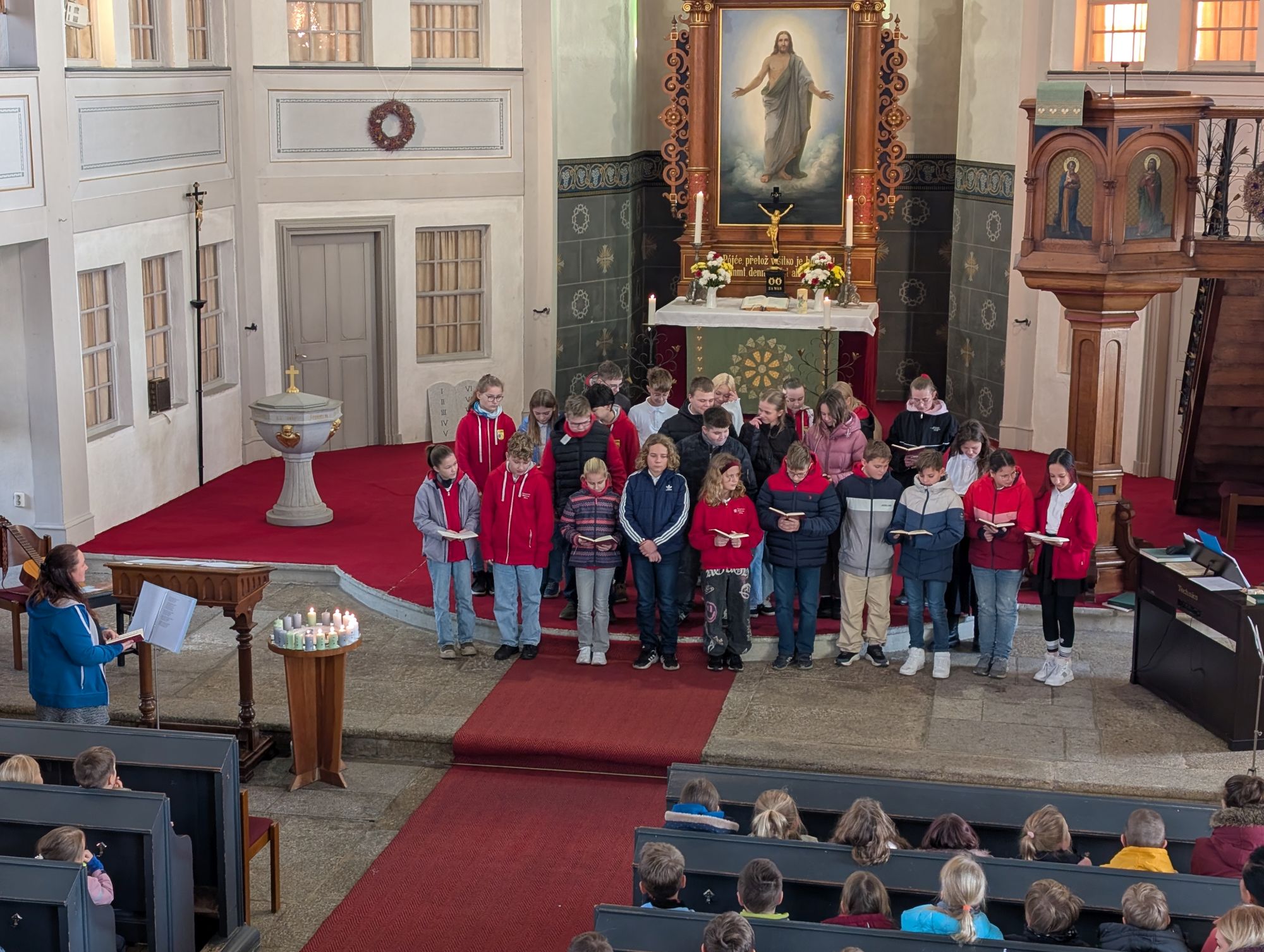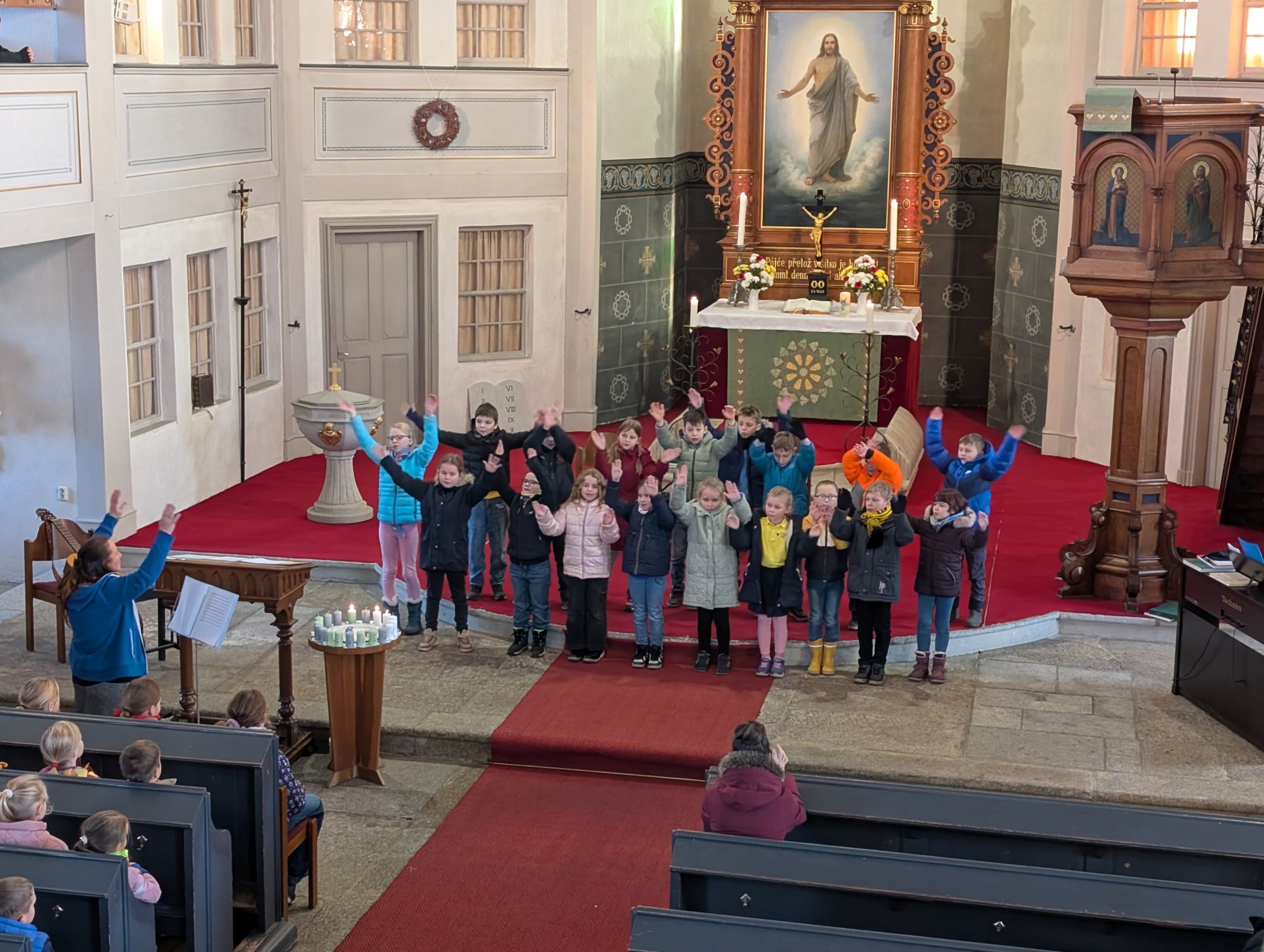 Frau Osang, unsere Religionspädagogin, hatte diesen Gottesdienst mit Schülern der Grundschule vorbereitet und alle waren mit viel Begeisterung bei der Sache.