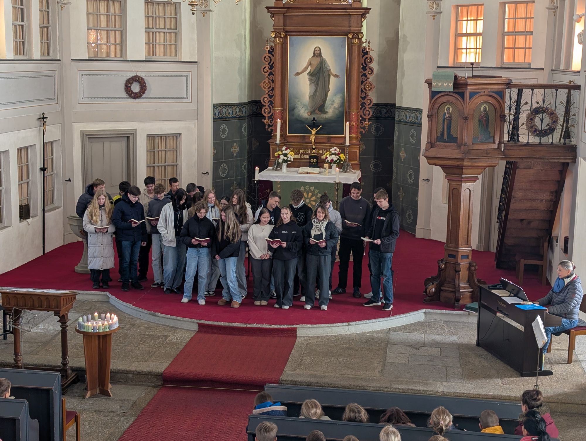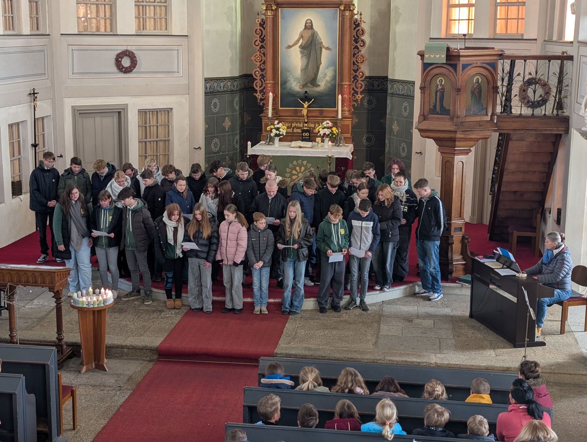 Unser Religionslehrer, Herr Gläsner, stimmte uns mit seiner Predigt auf das bevorstehende Weihnachtsfest ein und beim gemeinsamen Singen der Weihnachtslieder breitete sich in der Oßlinger Kirche festliche Weihnachtsstimmung aus.