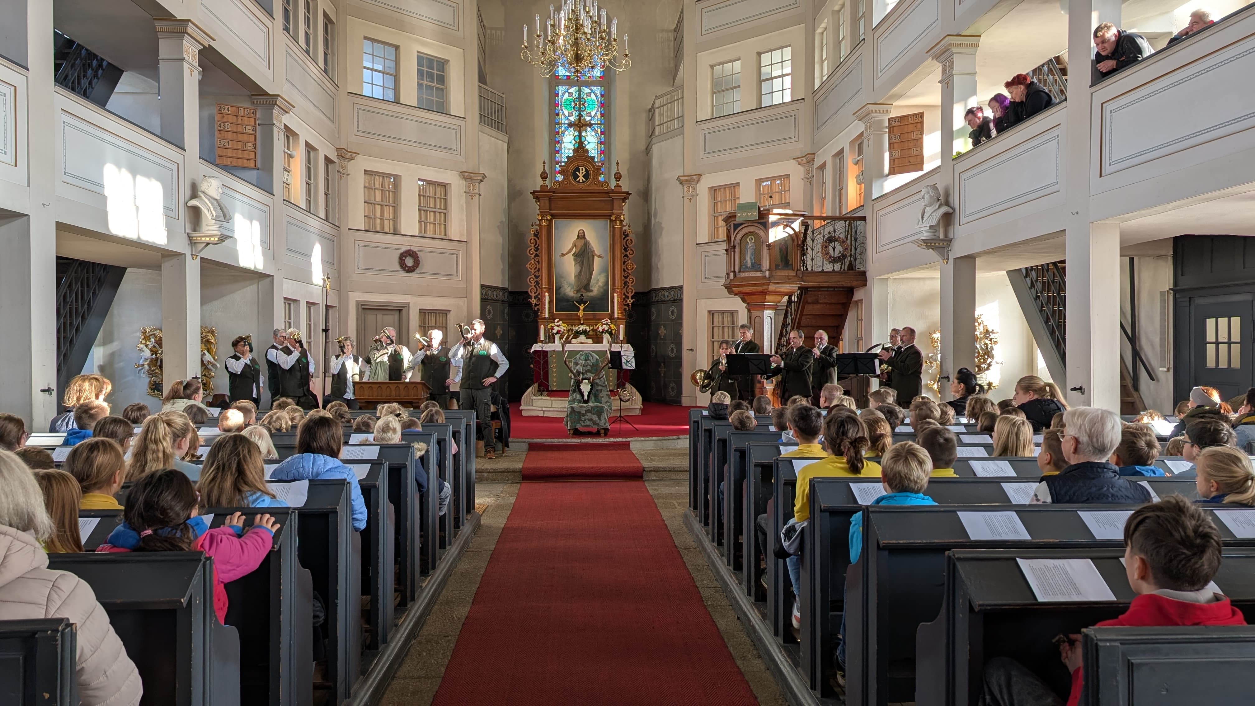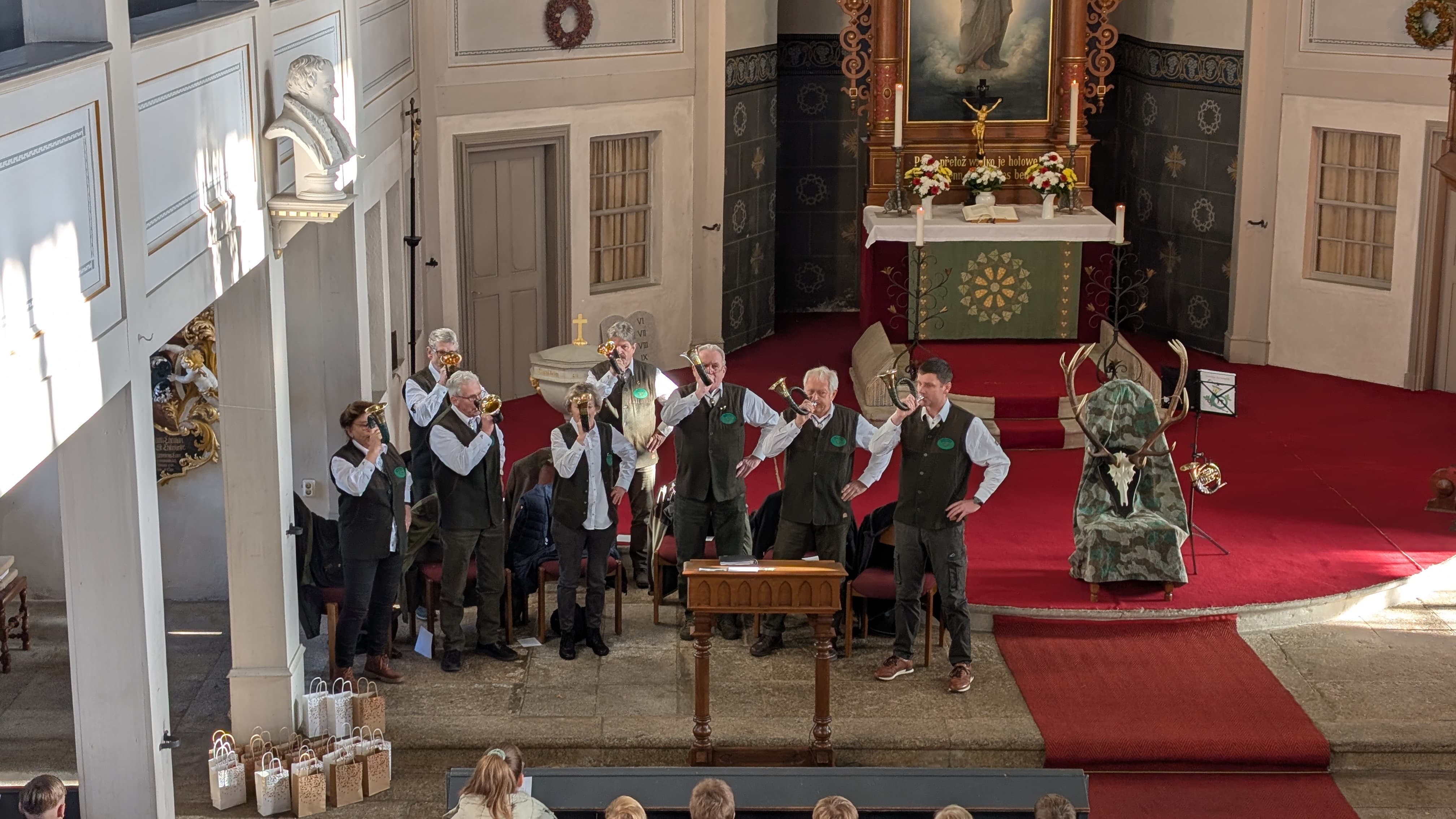 Untermalt wurde der Gottesdienst ebenso von den Jagdhornbläsern „Elsterwald“ mit ihren Plesshörnern, die verschiedene Signale der Jagd zu Gehör brachten.